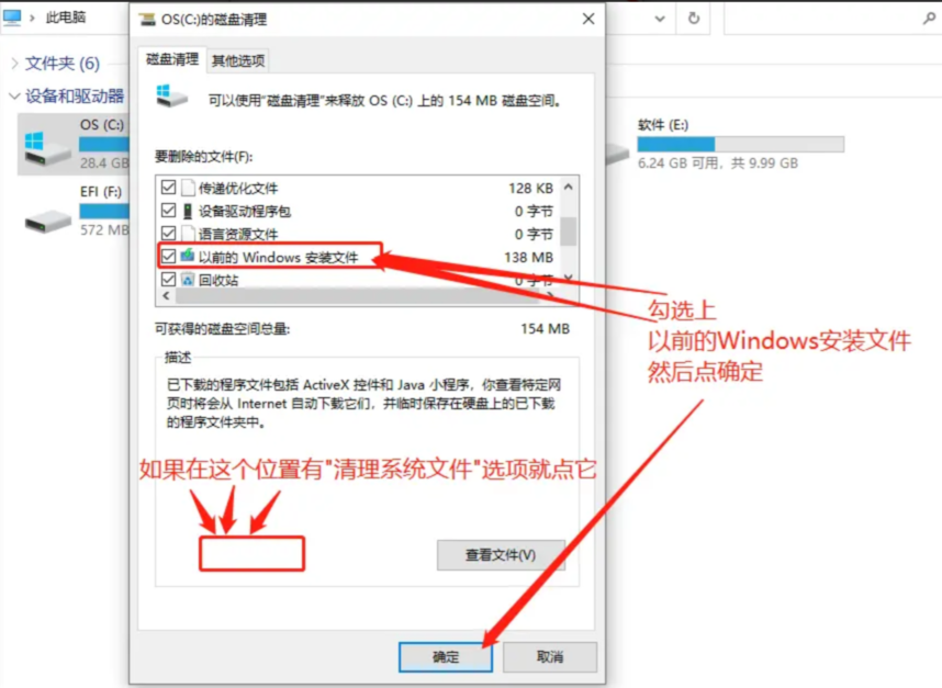 找到 “以前的 Windows 安装文件” 选项 勾选上 点确定